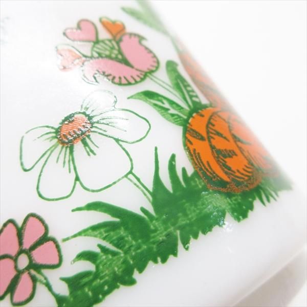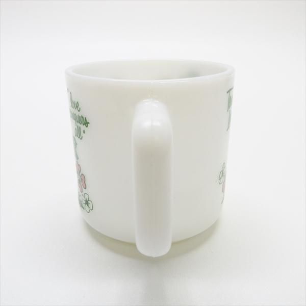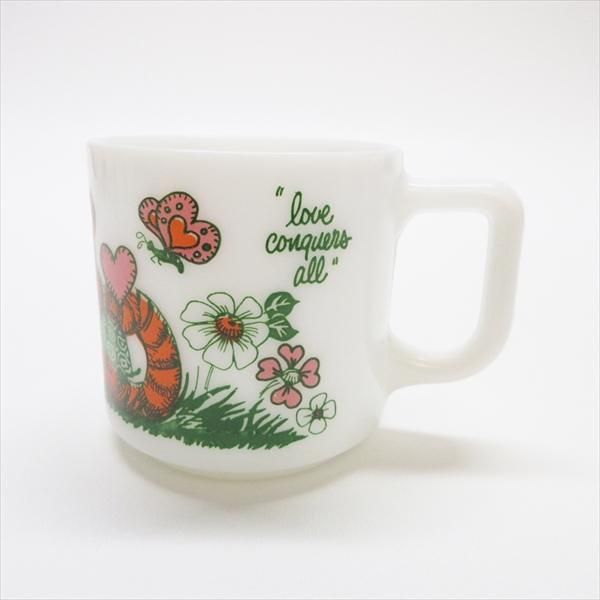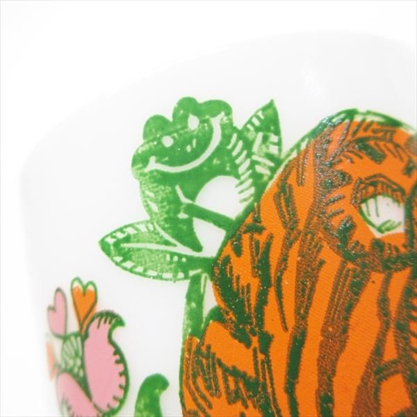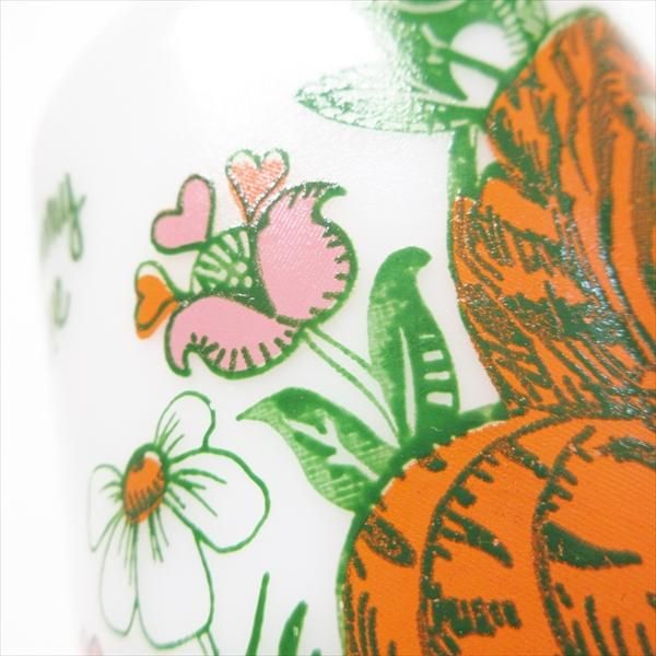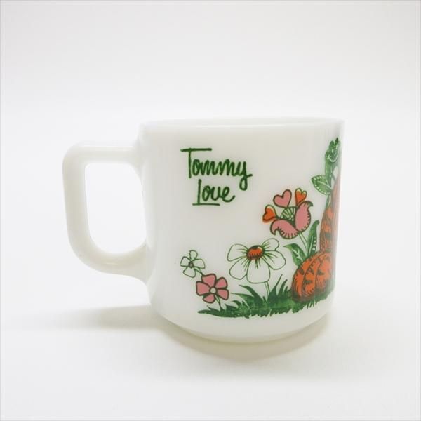 現時点ではメーカーが確定しないミルクグラスのマグカップ。実はシリーズになっており、全種発見するのはかなり困難なコレクタブル。トラさんの名前はプリントされている「トミー」です。
